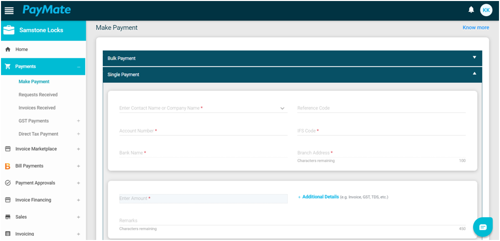 To book a single payment to a vendor, go to Payment>Make Payment, by default Single Payment section screen is displayed. The single payment form broadly requires the contact information, Amount information & the payment mode details to book the payment.