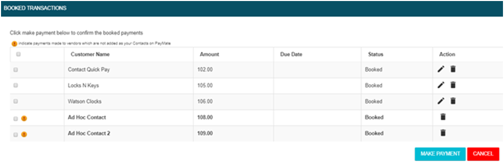 Click on the Book Another button to book another payment or click on Continue to proceed. The payment will then appear under Booked Transactions for you to verify and confirm. Select the payments you want to confirm for booking and click on Make Payment to confirm booking of payment.