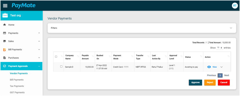 In case you have setup Payment Approval Workflow, on accepting a Payment Request or booking a payment from Make Payments, the transactions will appear under Payment Approvals>Vendor Payments page for approvals.