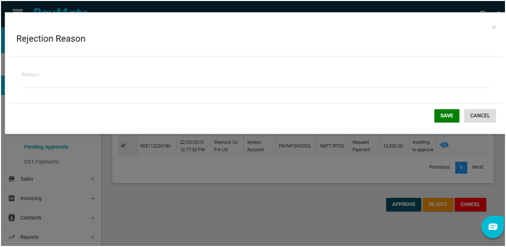 If you wish to reject a payment, you can click on Reject, a pop-up window Rejection Reason will appear. You will be requested to enter a reason for rejection. Once payment is rejected, you can find that transaction inReports>Payments. The status of the said transaction will be Aborted.