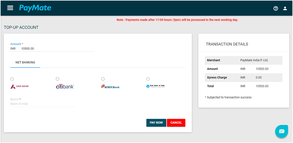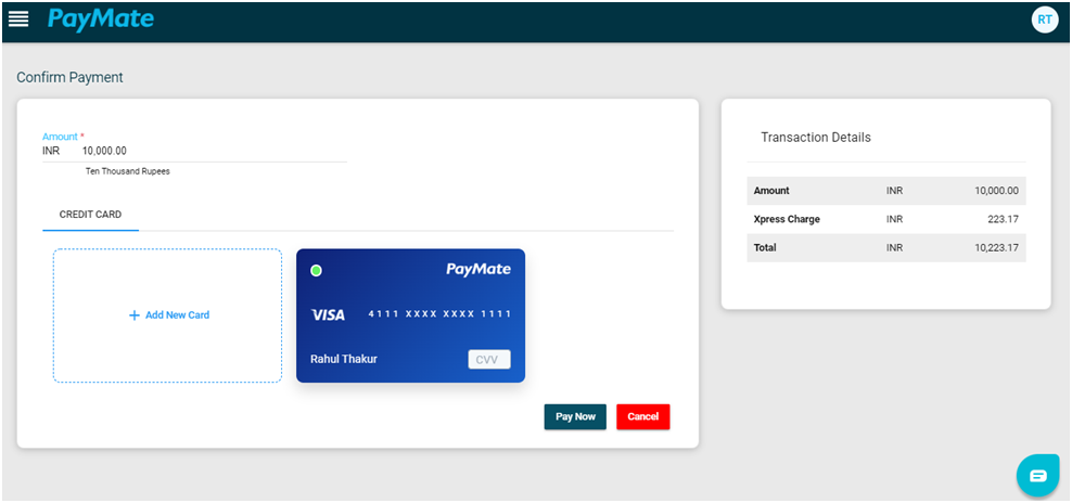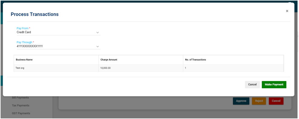 Once the transactions pending for approval are approved, the final Approver or the user with Payer access (if configured) on clicking Approve will be redirected to the Process Transactions pop-up screen to make the payment. In Pay From, select any one of the options- Credit Card, Net Banking or Xpress Account.