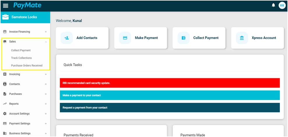 The Sales tab provides you with the option to collect payments from your customer seamlessly. It helps you manage your complete accounts receivables. You can simply select the contact of the customer already added to your business, enter the amount and book the payment.