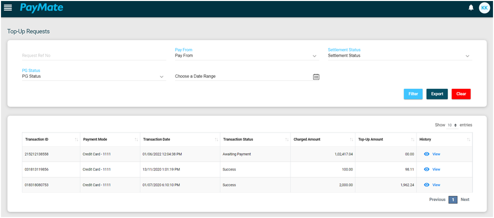 All the transactions performed to top-up your Xpress Account are recorded in the Top-up Requests report. You can filter the data based on the Pay From, Settlement Status, PG Status and date range. You can extract the top-up request details in excel by clicking on Export.