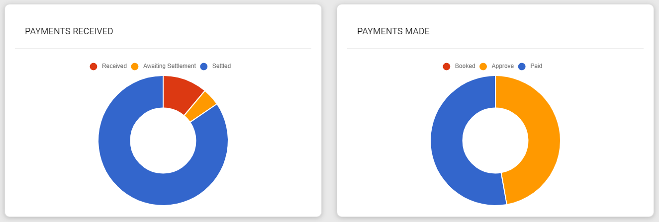 This section shows the status of current ongoing transactions for Payments and Collections. The status of the transaction is displayed in a pie chart to provide you with a quick overview of the transaction statuses.