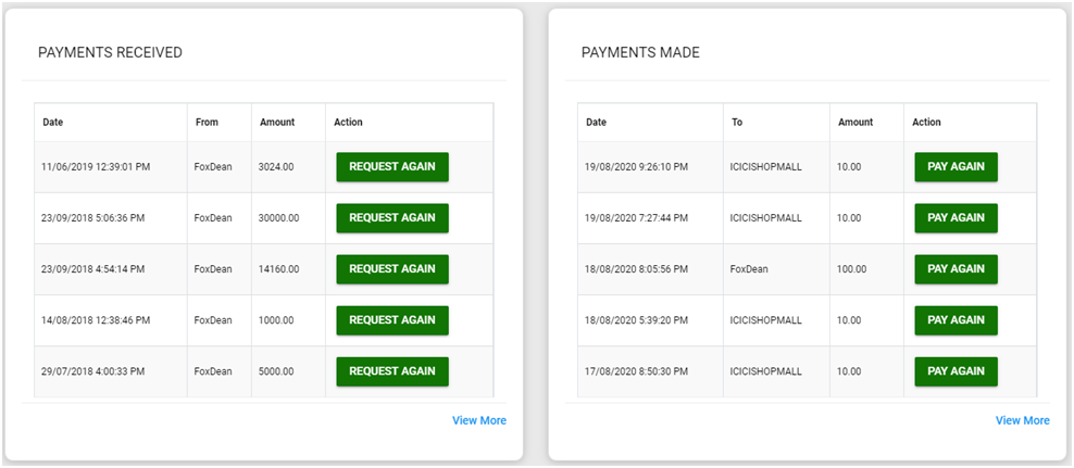 This section shows the 5 most recent transactions that were completed on the platform. Each transaction has a button that will allow you to quickly create a new transaction with the same details as the older transactions. The View More option at the bottom will take you to the Reports section to view all transactions.