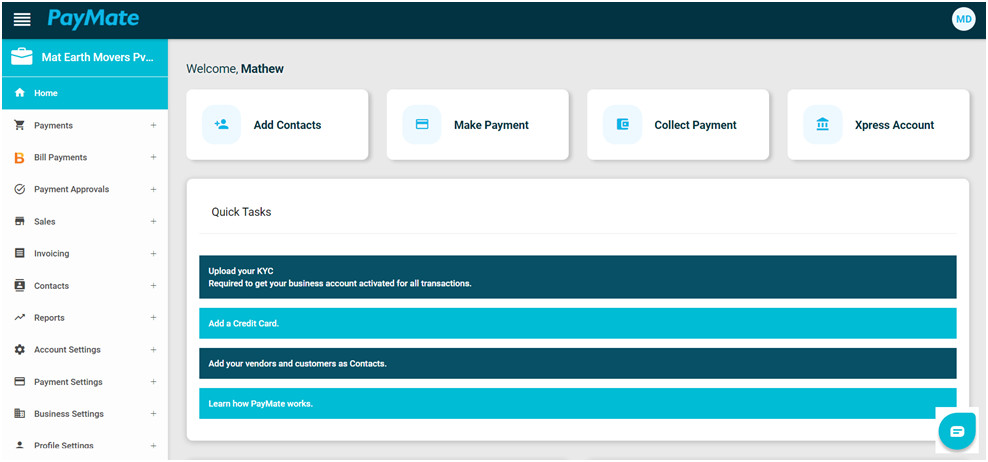 Once you login to your PayMate account, you will be landing onto the Dashboard screen. The dashboard on PayMate is designed to provide users with the most updated information about their business.