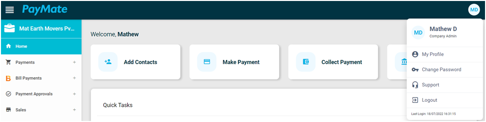 The profile details towards the extreme right of your Dashboard highlighted with Initials of your name, clicking on it would display a drop down displaying your name, the user role that you are assigned, access support. You can choose to change your profile password or just simply log out from your business account.