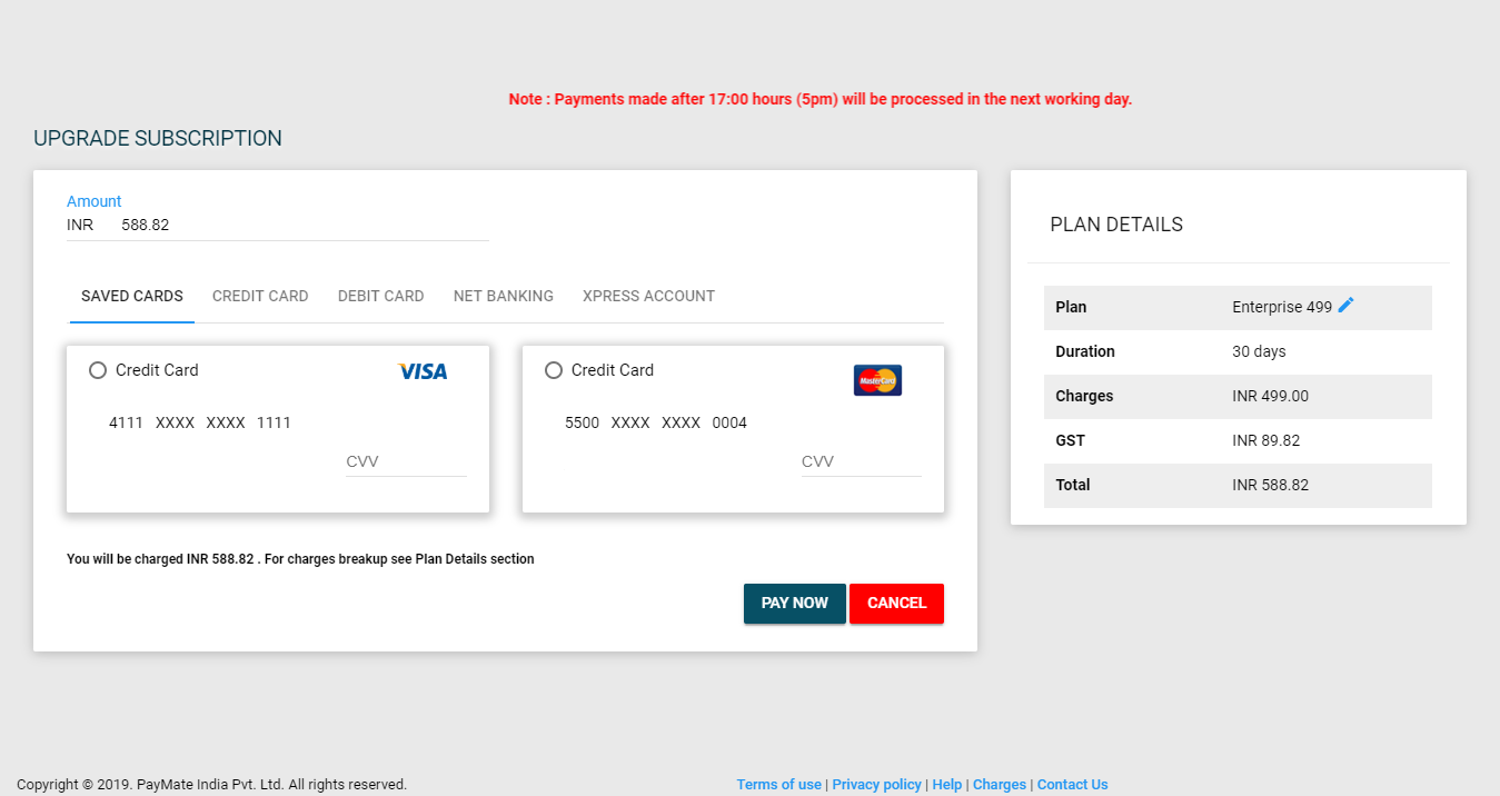 Upon clicking on Buy Now, you will be redirected to a payment page. You can buy a subscription plan using a credit card, debit card, net banking, and Xpress Account (provided there is a sufficient balance in Xpress Account). You can either use saved cards or use a new credit/debit card to make payment. You have an option to save that card for future use to make subscription payments. If you are upgrading from a free plan, then Xpress Account payment mode will not be available.