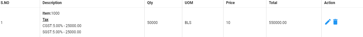 Once the product details are entered, you need to click on “save” or “cancel” in Actions on each line item entered. You also have an option to edit/delete the line item added.