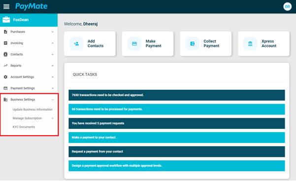 This tab enables you to update your business information, view subscription history, manage and upgrade subscription. You can also view uploaded KYC documents from this tab. Screen shot of Business Settings menu is given below:
