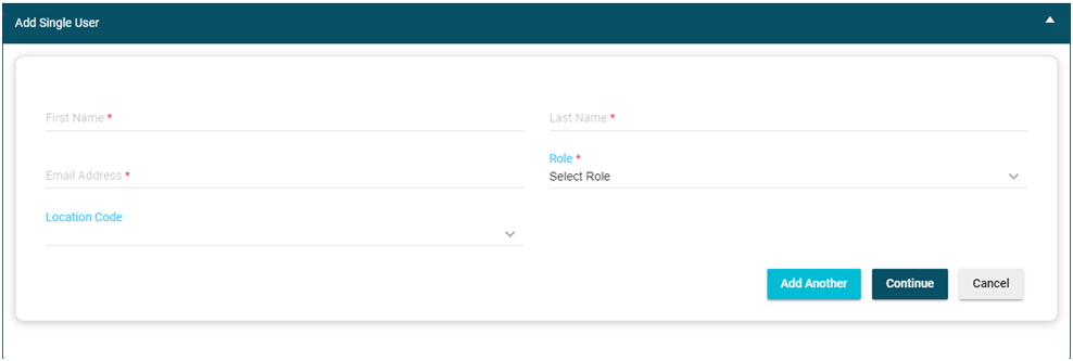 Navigate to Menu> Account Settings> User Settings> Add User to start adding users. Enter the First Name, Last Name, and Email Address information. Select the appropriate role from the drop down menu. Tag one or more location code from the drop down to give access to the user for selected location codes. Click on Continue to Add User, or Add Another to continue adding users in batch. The new user will receive a welcome email from PayMate to get onboarded.