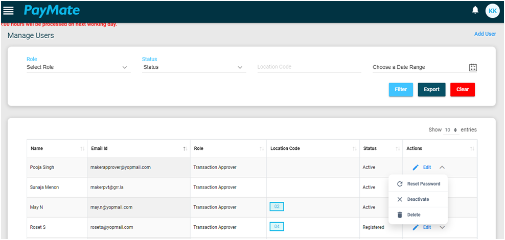 Manage users tab is available to edit, delete, deactivate or reset password of a user. The Status column represents the current status of the user. More on the various status maintained are represented in the table below. Additionally, the filters to sort the table with Role, Status, Location code are made available to sort and find.