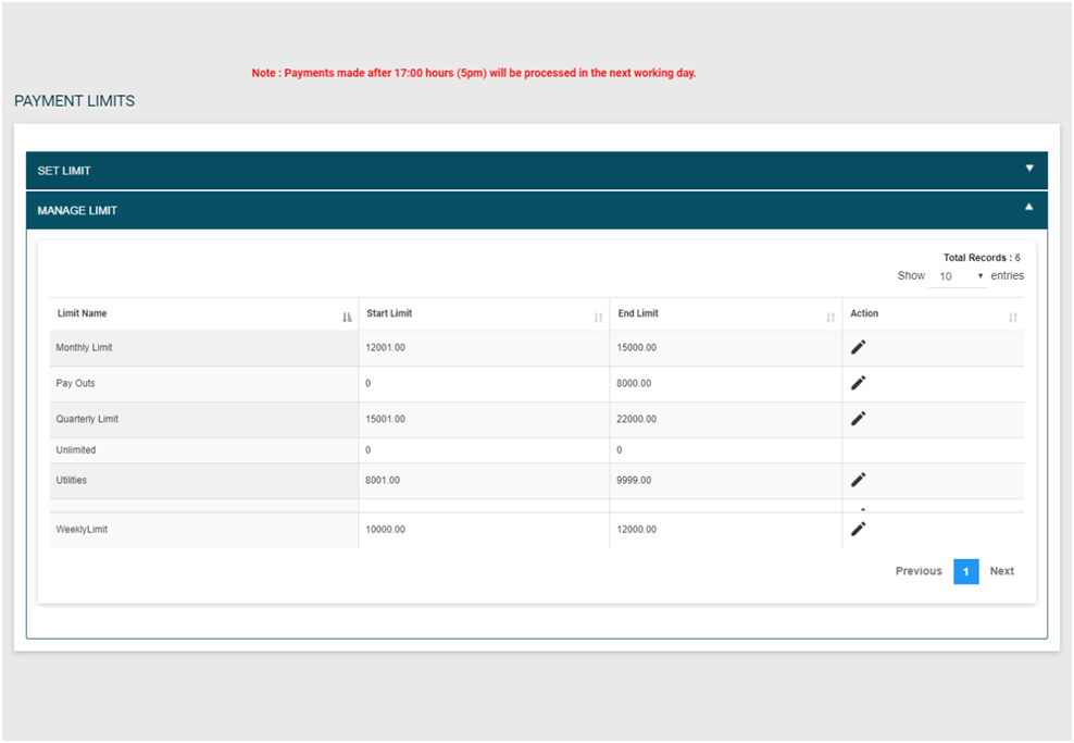 This screen enables you to manage already created payment limits. All the limits created can be accessed to view or edit from here. Use this screen to edit the details of the limit - Limit Name, Start Limit, and End Limit.