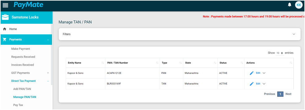 Once the PAN/TAN details are registered with PayMate, it will be displayed under the Manage PAN/TAN screen. Options to edit/delete the entity details are available on this screen.